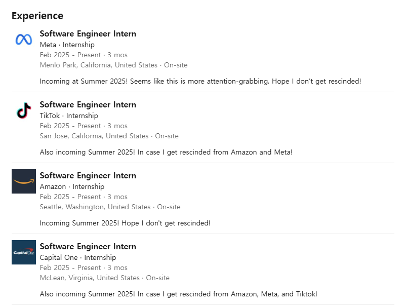 그들은 이 생각을 실행에 옮겼고, 실제로 Roy는 직접 개발한 Interview Coder를 사용해 Meta, Tiktok, Capital One, Amazon의 인턴십에 합격했다. 그리고 이를 자랑스럽게 LinkedIn에 박제(?) 해 놓았으나, 사내 이메일 인증을 하지 못해 결국 계정이 정지 당했고 해당 경력들은 현재 모두 내려간 상태이다.