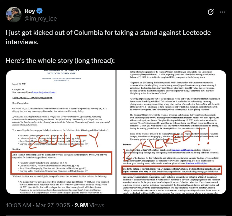 단기간에 엄청난 명성을 얻은 대가로 Roy는 결국 재학 중이던 콜롬비아 대학교에서 쫒겨나게 되었는데, 이 모든 일이 일어난 직후 그간의 이야기를 직접 정리해 X에 업로드 하였다. 오늘은 필자에게 깊은 감명을 준 이 이야기를 다루어 보려고 한다.